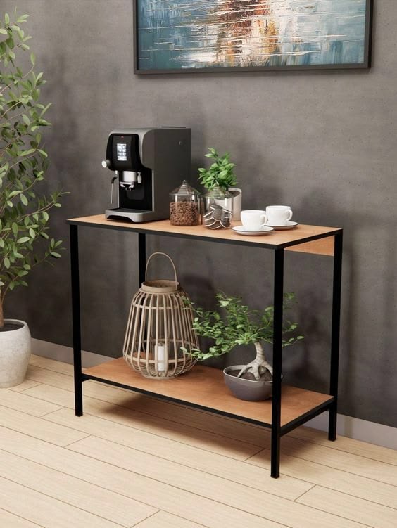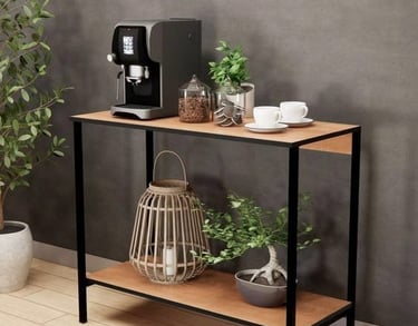 É uma peça versátil de design que une a sofisticação da madeira nobre à resistência do metalon. Ele serve para transformar corredores, halls de entrada ou livings, oferecendo um suporte elegante para decorações, livros ou bebidas, unindo funcionalidade e presença estética.